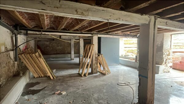 📸 El sótano tiene unas vigas perimetrales de refuerzo de los muros y la nueva solera y se ven tubos de los nuevos desagües en la parte izquierda y los premarcos de las puertas que van en la obra